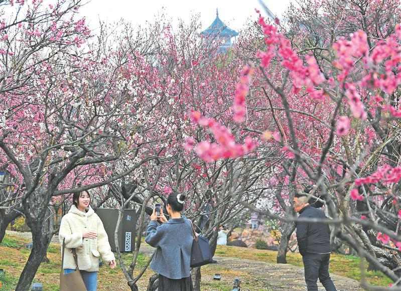 近日,作为江南著名赏梅胜地,无锡梅园景区内梅花竞相绽放,吸引众多市民游客纷至沓来,赏花拍照。(还月亮)
