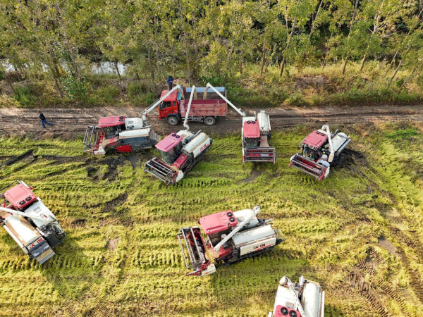 各大农场是“三秋”生产的主力军,呈现出各具特色的丰收图景。岗埠农场自10月26日起启动杂交水稻收割,31名督查员奔赴田间开展质量督查,确保收割标准落实到位。10月27日当天,农场就组织61台收割机、52台运粮车和25台翻粮车投入作业,收获杂交水稻近2000亩,后续将有更多农机加入收割大会战。云台农场则实现秋收秋种“双线并进”,自10月24日起,6000亩水稻进入集中收获期,履带式收割机抢收水稻与小型旋耕机旋耕备种同步开展,田间地头呈现“收种并举、颗粒归仓”的繁忙景象。