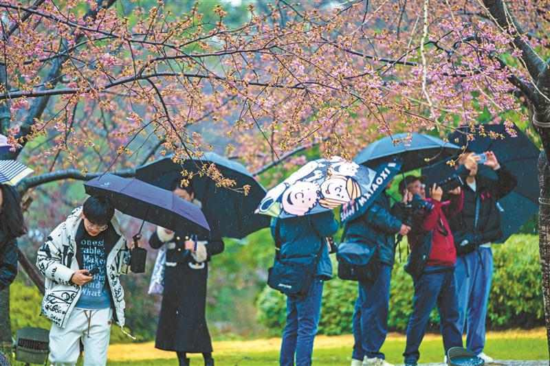 从鼋头渚充山大门进入,途经充山隐秀、十里芳径、樱花谷,一路走来,饱满的粉白花瓣已经在舒展身姿。河津樱带着嫩绿的新叶在枝头同放,椿寒樱成簇地挤挤挨挨,凑近还能闻到清浅的甜香。虽然阴雨连绵,但不少市民已经迫不及待地撑着伞踏入花径,寻觅那一抹属于早春的温柔。