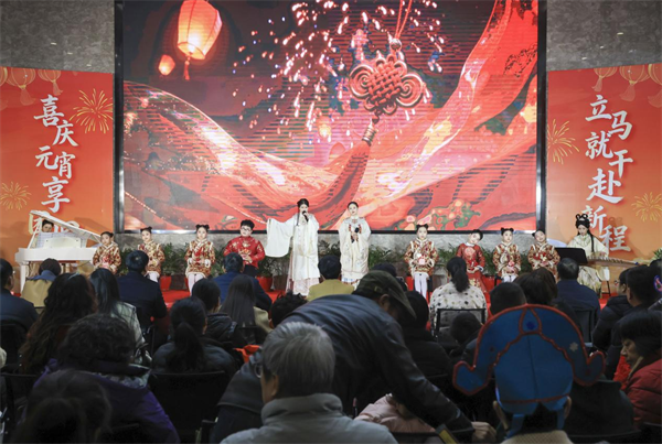 室内文艺舞台精彩纷呈,奏响团圆与文明的乐章。音诗画《诗词里的元宵节》以经典吟诵搭配筝琴伴奏,重现辛弃疾笔下元宵盛景,中青年与青少年联袂演绎,让诗词古韵浸润人心;情景表演《文明家风暖元宵》取材社区真实故事,诉说孝老爱亲、邻里互助的暖心日常;省道德模范、志愿者、新就业群体代表与少先队员,以“四盏灯”为喻分享初心故事,传递文明力量。幽默相声消解节后疲惫,获奖歌曲《一路生花》以励志旋律点燃全场激情,掌声与欢笑声此起彼伏。