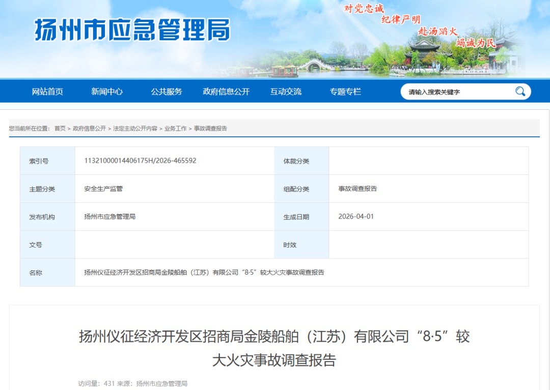 4月1日,扬州市应急管理局发布了《扬州仪征经济开发区招商局金陵船舶(江苏)有限公司“8·5”较大火灾事故调查报告》。调查报告显示,2025年8月5日,仪征经济开发区招商局金陵船舶(江苏)有限公司发生一起火灾事故,造成3人死亡,直接经济损失约896万元。