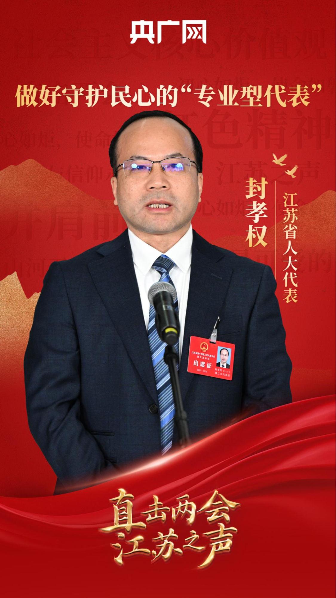 央广网南京2月3日消息(记者王锡斐)2月3日上午,江苏省第十四届人民代表大会第五次会议举行“代表通道”集中采访活动,9名人大代表走上“代表通道”,就热点问题回答记者提问。北京大成(镇江)律师事务所管委会主任封孝权连续三届当选省人大代表,他分享了自己如何借助法律专业服务经济发展、推动地方立法工作、破解民生难题的故事。