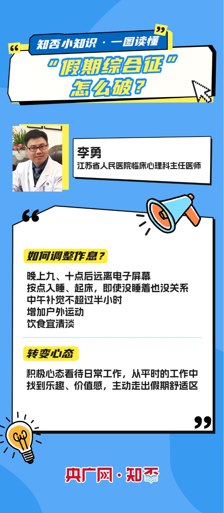 李勇介绍,假期综合征虽不在疾病诊断名录中,却是长假后常见的适应不良表现。他建议,调整应从“与光同频”开始,晚上九、十点后尽量远离电子屏幕,按点睡觉,即使没睡着也没关系,早上按点起床;白天循序渐进增加快走、慢跑、骑行等户外运动,多晒太阳;饮食宜清淡,给肠胃减负。此外,中午可以适当补觉,尽量不超过半小时。